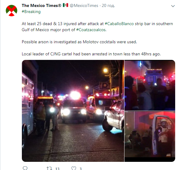 В итоге по меньшей мере 25 человек погибли и 13 получили ранения после этого нападения. Уточняется, что местный лидер картеля CJNGУ был арестован в городе менее 48 часов назад. Вполне возможно, что эта бойня была местью за арест.