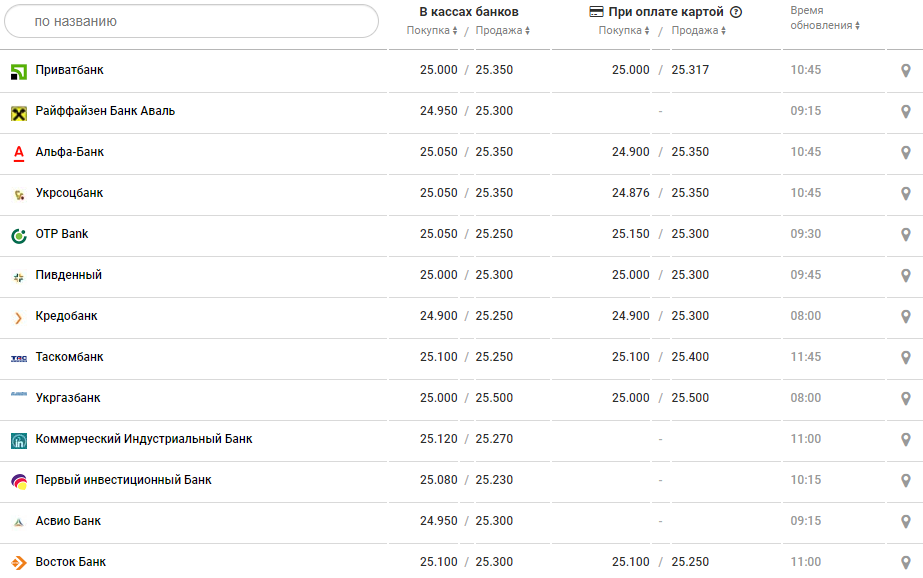 В банках курс доллара с утра такой: покупка от 24,8 до 25,1 грн (покупка) и от 25,2 до 25,32 грн продажа.
