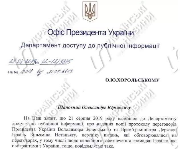 На вопрос журналистов, обсуждался ли во время встречи президента Украины Владимира Зеленского и премьер-министра Израиля Беньямина Нетаньяху вопрос выплаты Украиной пенсий гражданам Израиля и какое решение было принято, в ОП отослали к материалам на сайте, где такой информации не было.