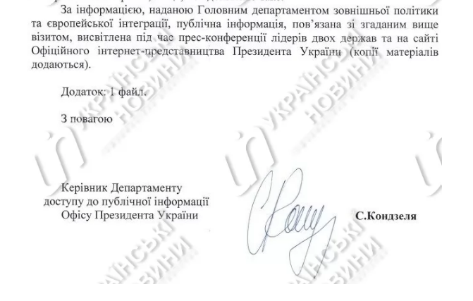 "По информации, предоставленной Главным департаментом внешней политики и европейской интеграции, публичная информация, связанная с упомянутым выше визитом, освещена во время пресс-конференции лидеров двух стран и на сайте Официального интернет-представительства президента Украины (копии материалов прилагаются)", - сказано в официальном ответе.