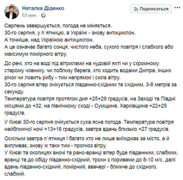 30 августа, в пятницу, в Украине погоду будет определять антициклон, благодаря которому установится сухой, ясный и теплый день. Об этом на своем Facebook сообщает синоптик Наталья Диденко.