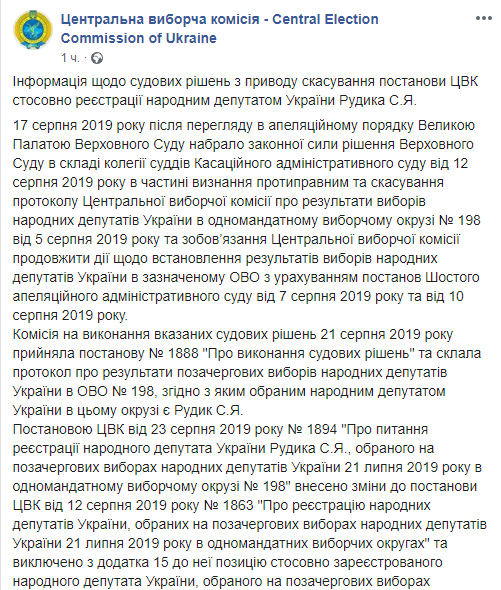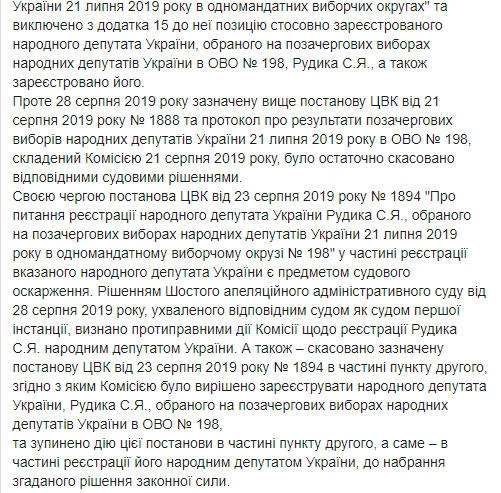 "Решением Шестого апелляционного административного суда от 28 августа 2019 года, принятого соответствующим судом как судом первой инстанции, признаны противоправными действия Комиссии по регистрации Рудика народным депутатом Украины. А также отменено указанное постановление ЦИК от 23 августа 2019 года… согласно которому Комиссией было решено зарегистрировать народного депутата Украины Рудика, избранного на внеочередных выборах народных депутатов… и приостановлено действие этого постановления…. в части регистрации его народным депутатом Украины, до вступления упомянутого решения в законную силу", - сообщается на странице ЦИК в соцсети Facebook.