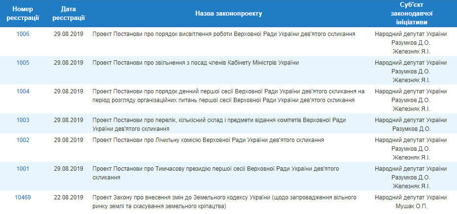 Одним из первых зарегистрированных законопроектов стал документ о внесении изменений в земельный кодекс Украины. Об этом сообщается на сайте Верховной рады. Также депутатам предлагается рассмотреть проекты постановлений об освобождении от должностей членов Кабинета министров, проект постановления по повестке дня первой сессии Рады на период рассмотрения организационных вопросов, о временном президиуме Рады, о счетной комиссии, а также о перечне, количественном составе и предметах ведения комитетов парламента.