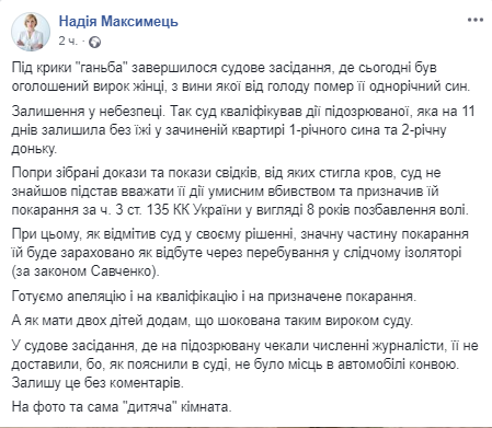 "Под крики "позор" завершилось судебное заседание, где сегодня был объявлен приговор женщине, по вине которой от голода умер ее годовалый сын. Оставление в опасности. Так суд квалифицировал действия подозреваемой, которая на 11 дней оставила без еды в закрытой квартире годовалого сына и двухлетнюю дочь", - написала она.