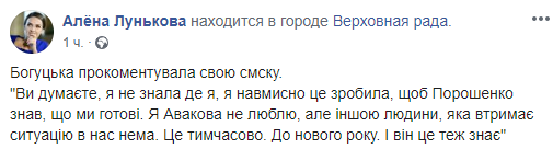 "Вы думаете, я не знала где я, я намеренно это сделала, чтобы Порошенко знал, что мы готовы. Я Авакова не люблю, но другого человека, который удержит ситуацию у нас нет. Это временно. До нового года. И он это тоже знает",- процитировала журналистка Богуцкую.