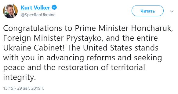 "Поздравляю премьер-министра Гончарука, министра иностранных дел Пристайко и весь кабинет министров Украины! Соединенные Штаты поддерживают вас в продвижении реформ, стремлении к миру и восстановлению территориальной целостности", - написал Волкер в своем аккаунте в Twitter.