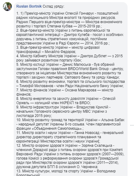 Политолог Руслан Бортник заявил, что в новом правительстве Гончарука нет "новых лиц", так как 90% министров работали с предыдущим Кабмином. Об этом он написал на своей странице в Facebook.