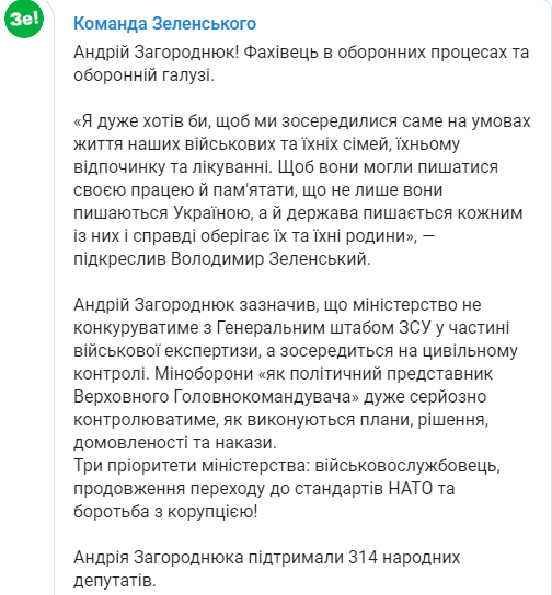 Кроме того, в команде Зе напомнили, что Андрей Загороднюк, за которого проголосовали 314 народных депутата, является специалистом в оборонных процессах и оборонной отрасли.