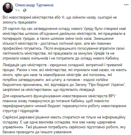 Все министерства, которые были созданы на заседании Верховной Рады 29 августа, и те, которые изменили свое название, не смогут работать, потому что у них нет утвержденных положений, штата и бюджета. Об этом в Facebook написал экс-секретарь СНБО Александр Турчинов.