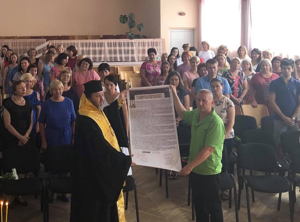 В Ровно перед началом учебного года священник ПЦУ подарил школе копию Томоса. Фото