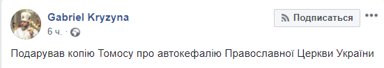 "Подарил копию Томоса об автокефальной Православной церкви Украины", - говорится в сообщении.
