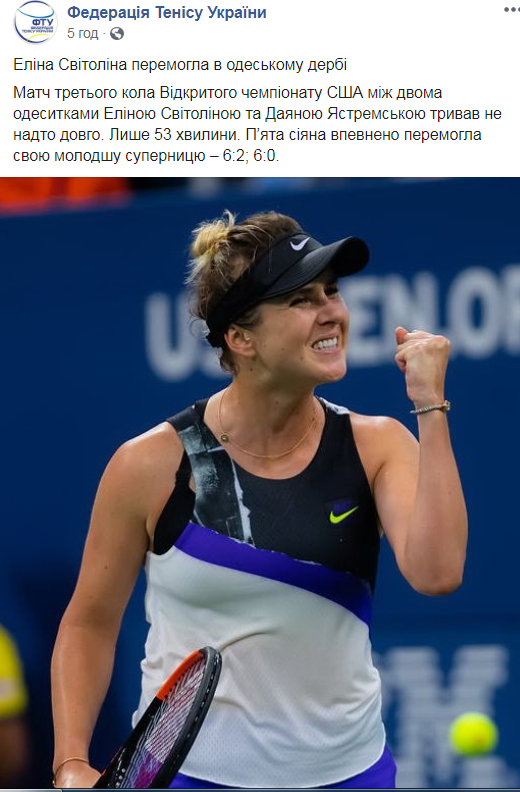 "Матч третьего круга Открытого чемпионата США между двумя одесситками Элиной Свитолиной и Даяной Ястремской продолжался не слишком долго. Только 53 минуты. Посеянная под пятым номером уверенно победила свою младшую соперницу - 6:2; 6:0", - уточнили в пресс-службе Федерации тенниса.