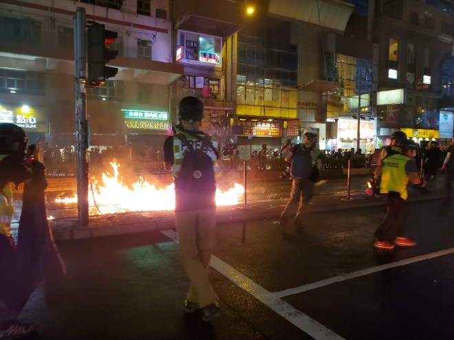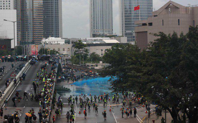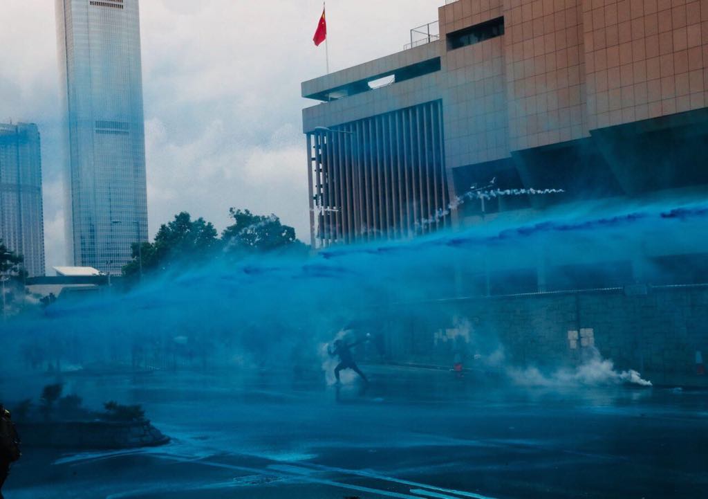 После этого акта насилия полиция Гонконга применила против протестующих водометы с синей краской.