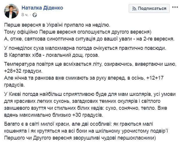 Понедельник 2 сентября, когда начнется новый учебный год, будет сухим и теплым, а местами жарким. Такой прогноз дает на своем Facebook синоптик Наталья Диденко.