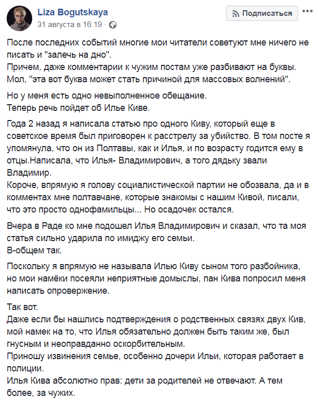 Народный депутат фракции "Слуга народа" Елизавета Богуцкая опровергла свою же давнюю запись в соцсети о преступлениях отца депутата "Оппозиционной платформы - За жизнь" Ильи Кивы и извинилась за публикацию. Об этом Богуцкая рассказала в своем Facebook.