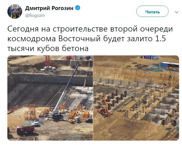 Между тем Рогозин в Twitter отрапортовал, что на строительстве второй очереди космодрома вот-вот будет залито 1,5 тысячи кубов бетона. Один из комментаторов написал, что по радио озвучили совсем иные достижения, заказчики не в восторге и рассматривают возможность привлечения к стройке других ведомств.
