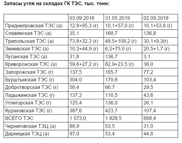 Запасы угля (антрацитового и газового) на складах теплоэлектроцентралей (ТЭЦ) составляют 128,3 тыс. тонн, что в 2,5 раза меньше (на 194,3 тыс. тонн), чем в начале сентября 2018 года.