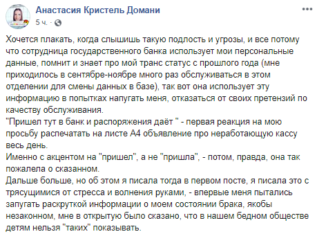 Инцидент произошел в отделении на Воздухофлотском проспекте. Анастасия-Кристель Домани сделала замечание сотрудникам банка из-за того, что в учреждении не работала касса, а объявления об этом не было. По словам девушки, менеджер, которая ее обслуживала, начала ее оскорблять, угрожать раскрыть ее личные данные, а также обращаться к ней в мужском роде.