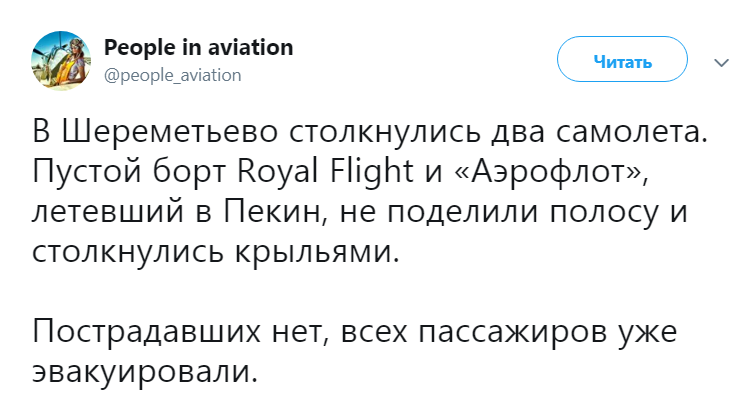 Как передают авторы микроблога, пустой борт Royal Flight и самолет "Аэрофлота", летевший в Пекин, не разъехались на полосе и зацепились крыльями.