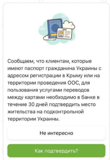 Там говорится, что клиенты, которые прописаны в Крыму или на Донбассе (не только "ЛДНР", но и вся территория Донецкой и Луганской областей), должны подтвердить в банке место жительства на подконтрольной территории.