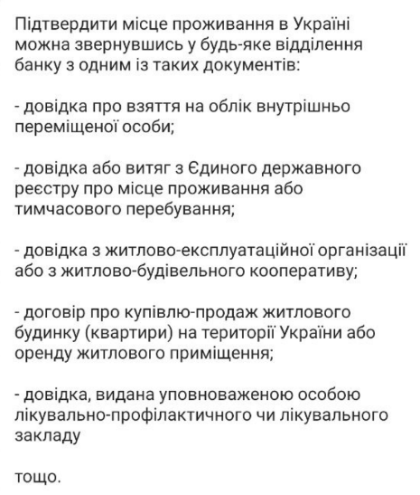 Подтвердить свое проживание в Украине предлагается путем физического обращения в отделение банка. Туда предлагается нести любые документы, которые удостоверяют регистрацию, пусть и временную, на подконтрольной территории.