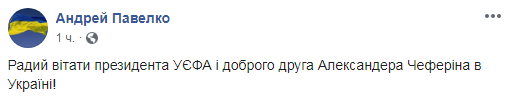 "Рад приветствовать президента УЕФА и хорошего друга Александера Чеферина в Украине!", - говорится в опубликованном сообщении.