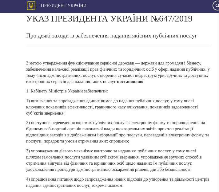 Президент Украины Владимир Зеленский подписал указ, согласно которому Кабинет министров должен обеспечить постепенный перевод отдельных публичных услуг в электронную форму, а также упростить процедуру предоставления услуг и внедрить механизм контроля. Соответствующий указ №647/2019 от 4 сентября опубликован на сайте главы государства.