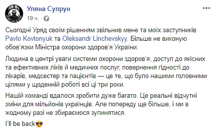 "Нашей команде удалось сделать очень много. Это реальные ощутимые изменения для миллионов украинцев. Но впереди еще больше, и мы ни в коем случае не собираемся останавливаться. I'll be back", - написала Супрун, повторив знаменитую фразу Терминатора из культового блокбастера.