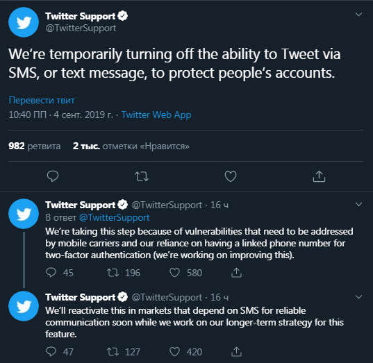 "Мы временно отключаем возможность размещать твиты через текстовые сообщения СМС, чтобы защитить учетные записи. Мы предпринимаем этот шаг из-за уязвимостей, которые должны быть решены мобильными операторами, и нашей зависимостью от двухфакторной аутентификации по номеру мобильного телефона", - сказано в сообщении.