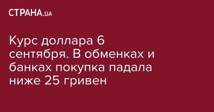 6 сентября НБУ поднял курс доллара на 5 копеек - до 25,31 грн по сравнению со вчерашним днем. В обменках к вечеру доллар покупают за 25,09 грн, продают - за 25,13 грн, не смотря на то, что котировки в обед падали ниже 25 грн в продаже. На межбанке к вечеру курс упал на 11 копеек: 25,05 грн в покупке и 25,08 грн - продажа. В банках доллар покупают от 24,80 грн до 25,20 грн, продают от 25,15 грн до 25,45 грн.