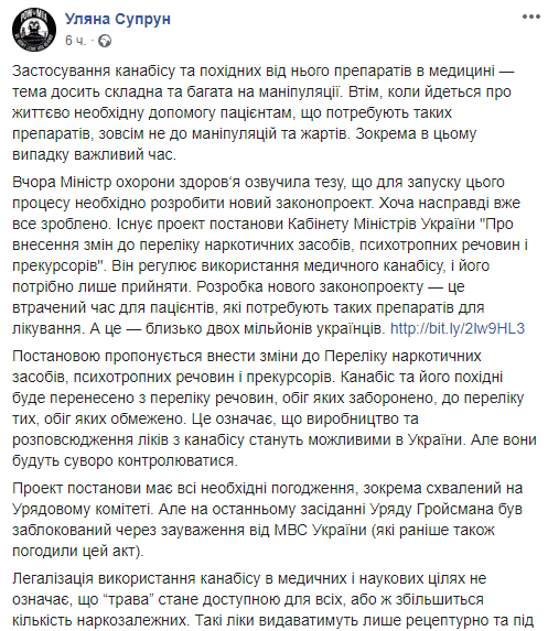 По словам Супрун, уже существует проект постановления Кабмина "О внесении изменений в перечень наркотических средств, психотропных веществ и прекурсоров", который регулирует использование медицинского каннабиса и этот документ нужно только принять.