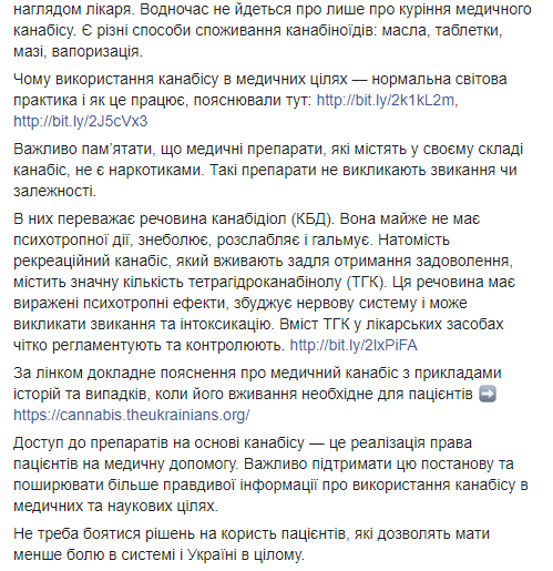 "Важно поддержать это постановление и распространять больше правдивой информации об использовании каннабиса в медицинских и научных целях", - заключила Супрун.