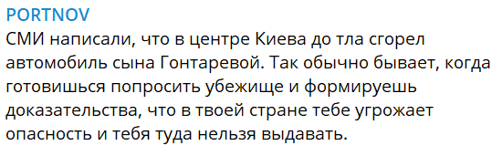 "СМИ написали, что в центре Киева до тла сгорел автомобиль сына Гонтаревой. Так обычно бывает, когда готовишься попросить убежище и формируешь доказательства, что в твоей стране тебе угрожает опасность и тебя туда нельзя выдавать", - написал юрист в Телеграм.