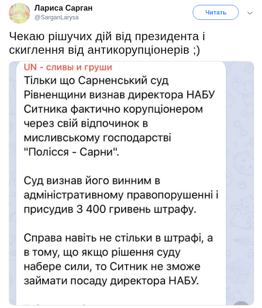 Сарненский суд Ровенской области постановил, что директор НАБУ Артем Сытник виновнен в коррупционном правонарушении. Теперь он не сможет занимать должность директора НАБУ.