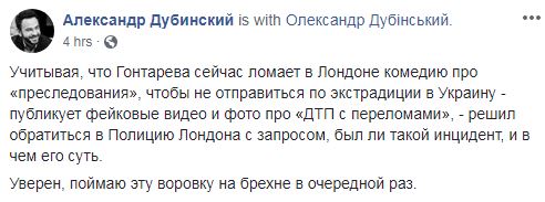 "Учитывая, что Гонтарева сейчас ломает в Лондоне комедию про "преследования", чтобы не отправиться по экстрадиции в Украину - публикует фейковые видео и фото про "ДТП с переломами", - решил обратиться в Полицию Лондона с запросом, был ли такой инцидент, и в чем его суть", - написал Дубинский.