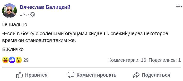 - Если в бочку с солеными огурцами кидаешь свежий, через некоторое время он становится такой же. В. Кличко"