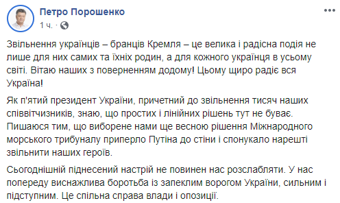"Как пятый президент Украины, причастен к освобождению тысяч наших соотечественников, знаю, что простых и линейных решений здесь не бывает. Горжусь тем, что завоеванное нами еще весной решение Международного морского трибунала приперло Путина к стене и побудило наконец освободить наших героев", - написал экс-гарант.