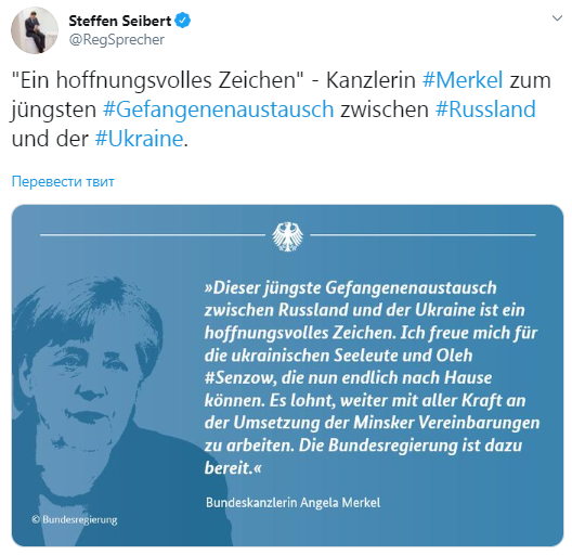 Канцлер Германии Ангела Меркель поздравила с удачным обменом пленными между Россией и Украиной, назвав этот шаг подающим надежду знаком. Об этом в Twitter сообщил представитель кабмина ФРГ Штеффен Зайберт.