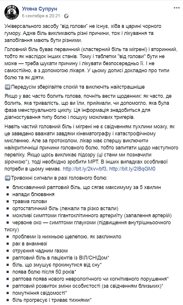 В конце пространного поста Супрун еще раз напоминает, что лечить надо причину, а не голову.