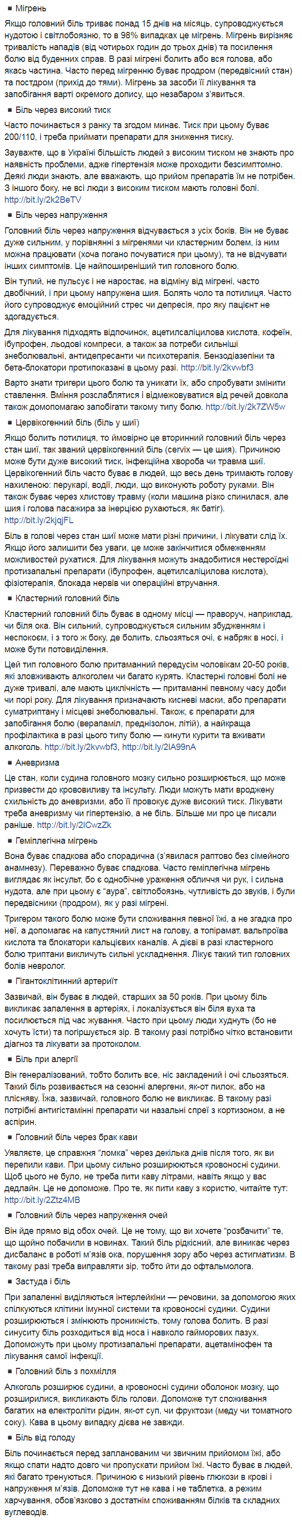Далее Супрун перечисляет типы боли, их причины и дает краткие советы, что с ними делать. В ее длинном списке болей значатся мигрень, боль из-за высокого давления и из-за напряжения, боль в шее, кластерная боль, аневризма, боль при аллергии, от голода, с похмелья и т.д.