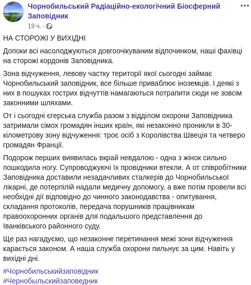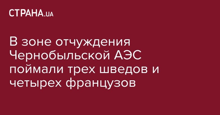 Егерская служба Чернобыльского радиационно-экологического биосферного заповедника совместно с отделом охраны заповедника 7 сентября задержали семерых иностранных граждан стран, которые незаконно проникли в 30-километровую зону отчуждения: три человека из Королевства Швеция и четверо граждан Франции. Об этом сообщает пресс-служба заповедника в Facebook.