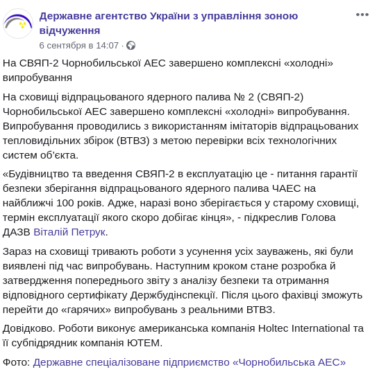 "Строительство и ввод ХОЯТ-2 в эксплуатацию это - вопрос гарантии безопасности хранения отработанного ядерного топлива ЧАЭС на ближайшие 100 лет. Ведь, пока оно сохраняется в старом хранилище, срок эксплуатации которого скоро истекает", - заявил председатель Государственного агенства Украины по управлению зоной отчуждения Виталий Петрук.