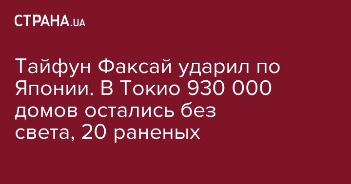 Сегодня ночью, 9 сентября, тайфун "Факсай" обрушился на Японию. Около 930 тысяч домов остались временно без электричества сообщила энергетическая компания TEPCO. Пострадали по меньшей мере 20 человек в соседней с Токио префектуре Тиба, где сильные дожди вызвали также оползень.