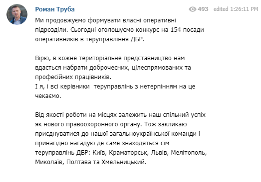 "Мы продолжаем формировать собственные оперативные подразделения. Сегодня объявляем конкурс на 154 должности оперативников в теруправления ГБР", - написал Труба.
