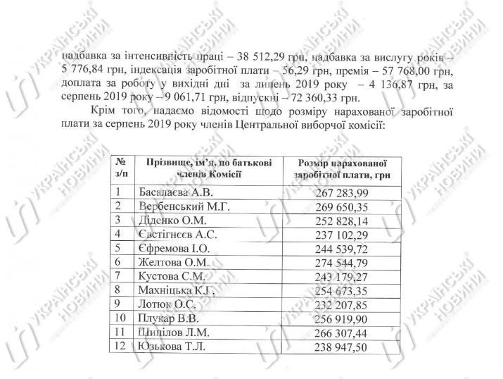 Зарплата остальных членов комиссии из не руководящего состава в августе была от 232,2 тысяч до 274,5 тысяч гривен.