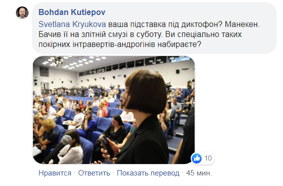 Сегодня работник "Громадського ТБ" Bohdan Kutiepov публично оскорбил нашего журналиста. Назвал ее "манекеном", "подставкой под микрофон", "андрогином" и призвал "нещадно пиздити" всех журналистов проектов, в которые Кутепова никогда не возьмут на работу, потому что у него начался период профессионального выгорания. Он уже не станет политиком, и ему уже поздно в активисты.