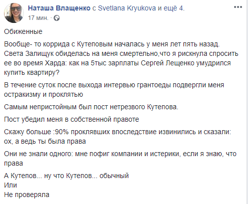 Вообще-то коррида с Кутеповым началась у меня лет пять назад. Света Залищук обиделась на меня смертельно, что я рискнула спросить ее во время Харда: как на 5 тыс. зарплаты Сергей Лещенко умудрился купить квартиру?