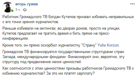 "Работник "Громадського ТБ" Богдан Кутепов призвал избивать неправильных, с его точки зрения, журналистов.