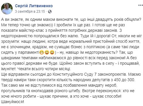 Примечательно, что в тот же день, 3 сентября, уже после кнопкодавства Литвиненко опубликовал пост в Facebook, где отметил, что "Слуга народа" введет лишение нардепа мандата за кнопкодавство.