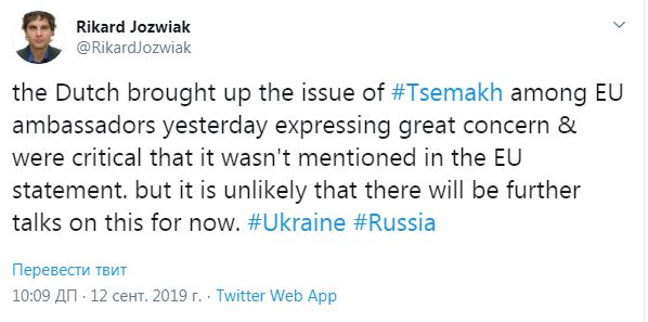 "Вчера голландцы подняли вопрос о Цемахе среди послов ЕС, выразив большую обеспокоенность, и критически отозвались о том, что этот вопрос не был упомянут в заявлении ЕС. Но вряд ли сейчас будут дальнейшие переговоры по этому вопросу", - написал Йозвяк.